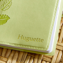 Le carnet de notes est doté d’une couverture amovible en simili cuir de couleur anis. Sur cette couverture des motifs de feuilles et de fleurs, gravés à chaud, apportent une touche de nature et de classe au carnet. Cet effet texturé se marie à un toucher très doux et des finitions en surpiqûres très soignées qui apportent au carnet de notes un esprit maroquinier.
